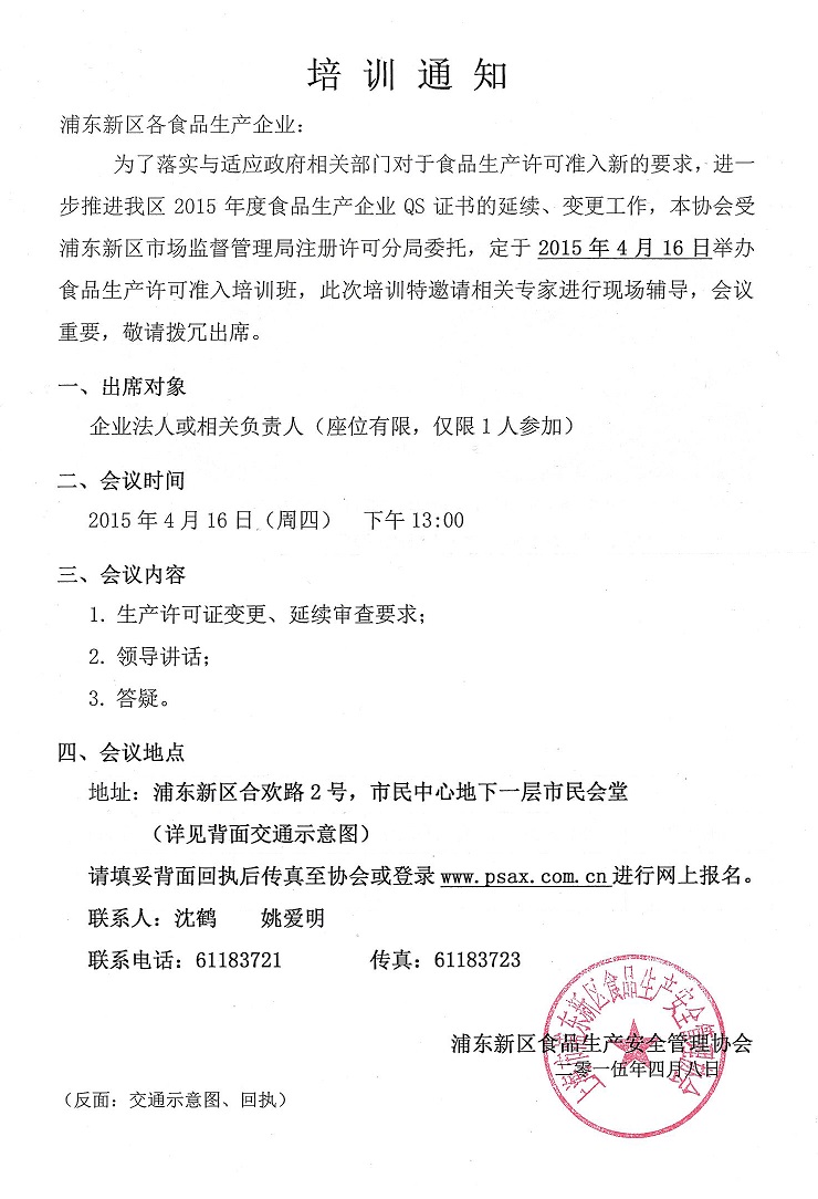 培训通知:食品生产许可准入培训班(2015年4月16日下午13:00)