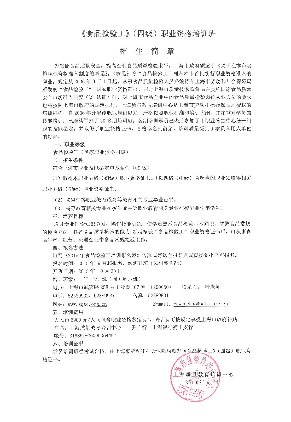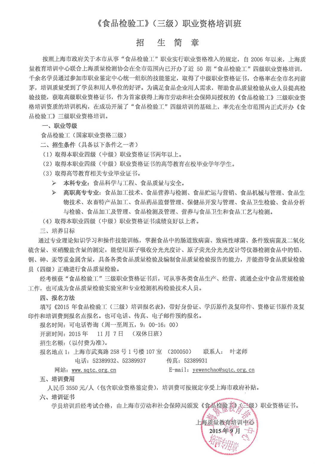 上海市质量教育培训中心将举办食品检验工辅导培训: