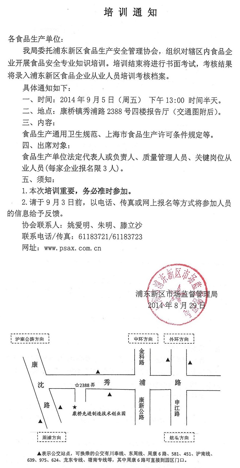 培训通知:食品安全法律法规和专业知识培训(9月5日下午)