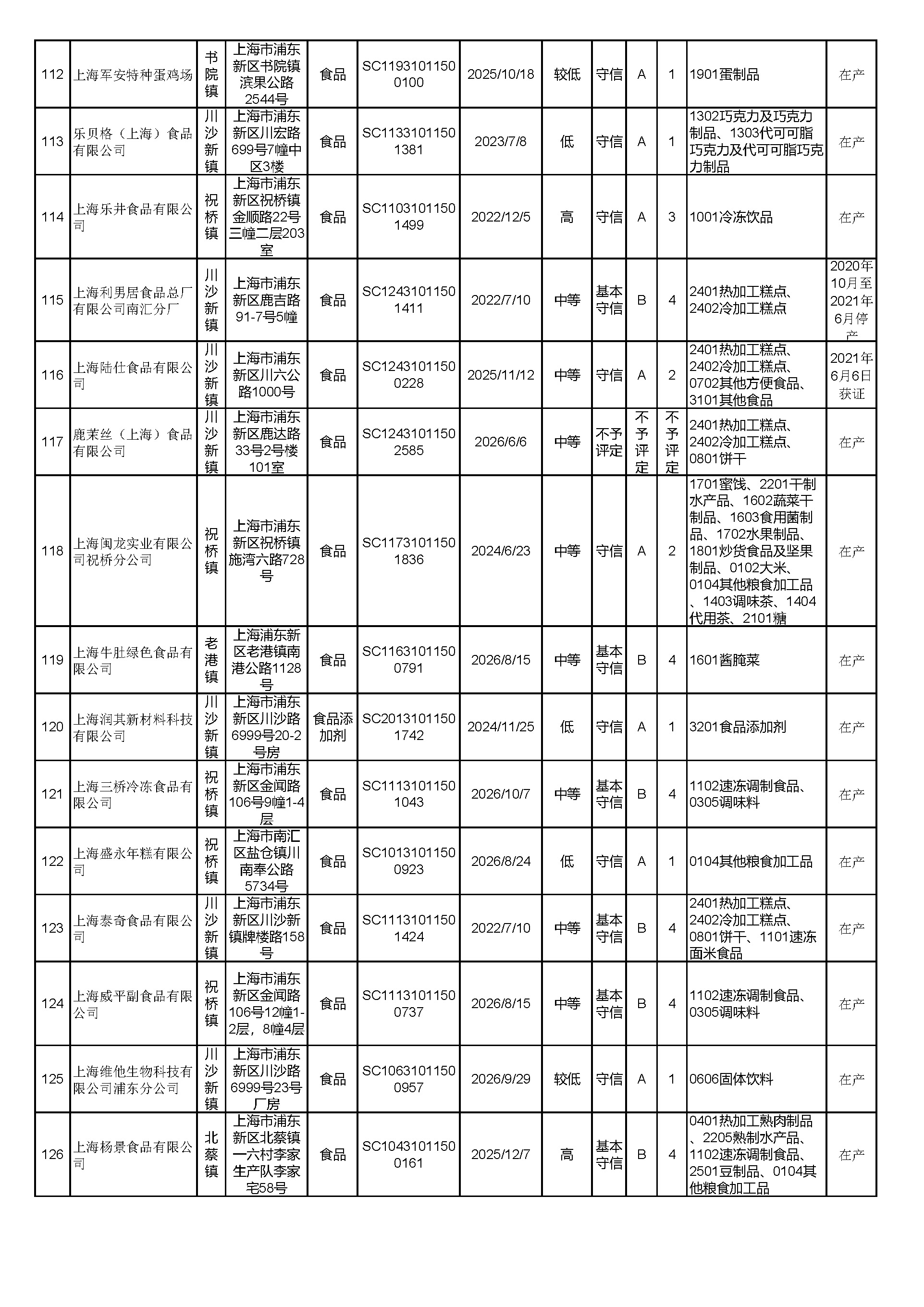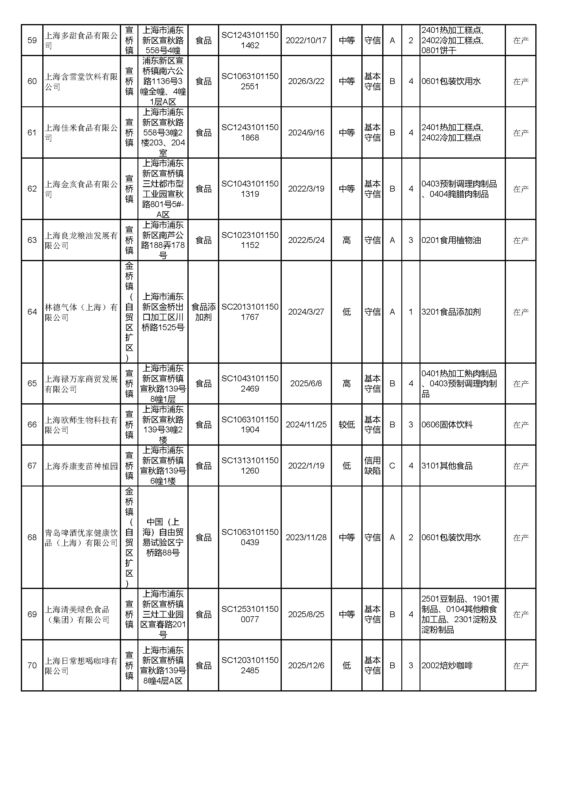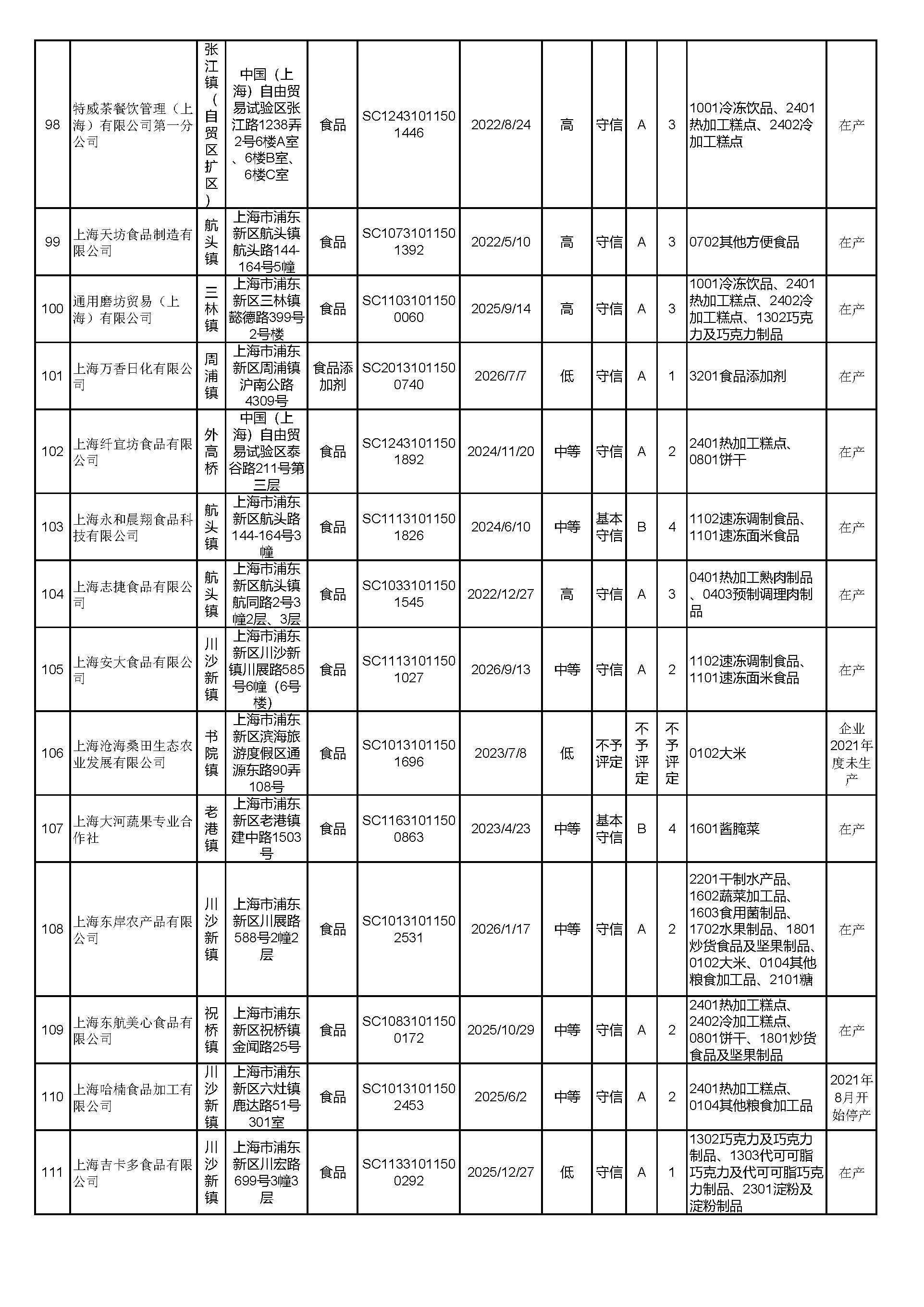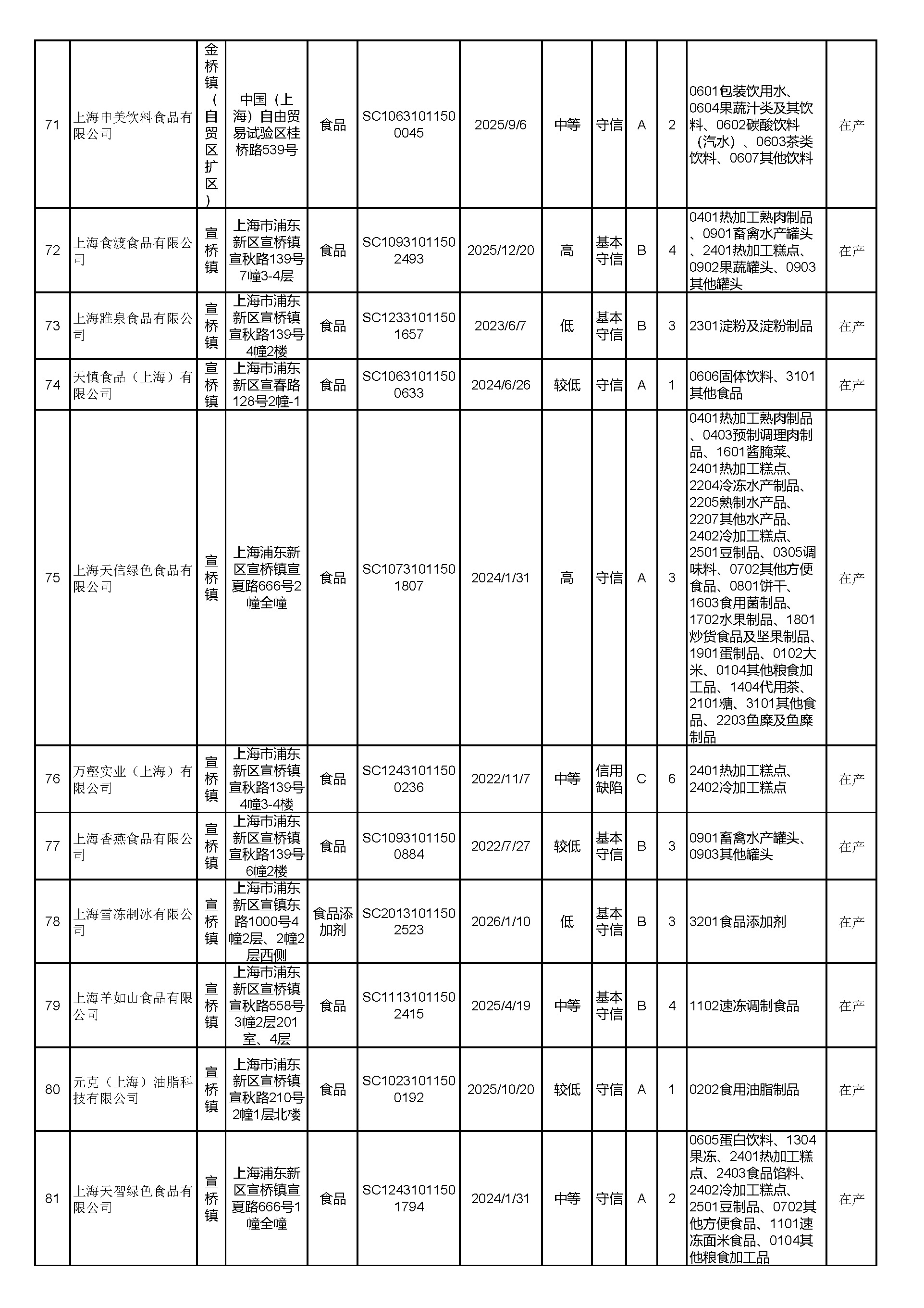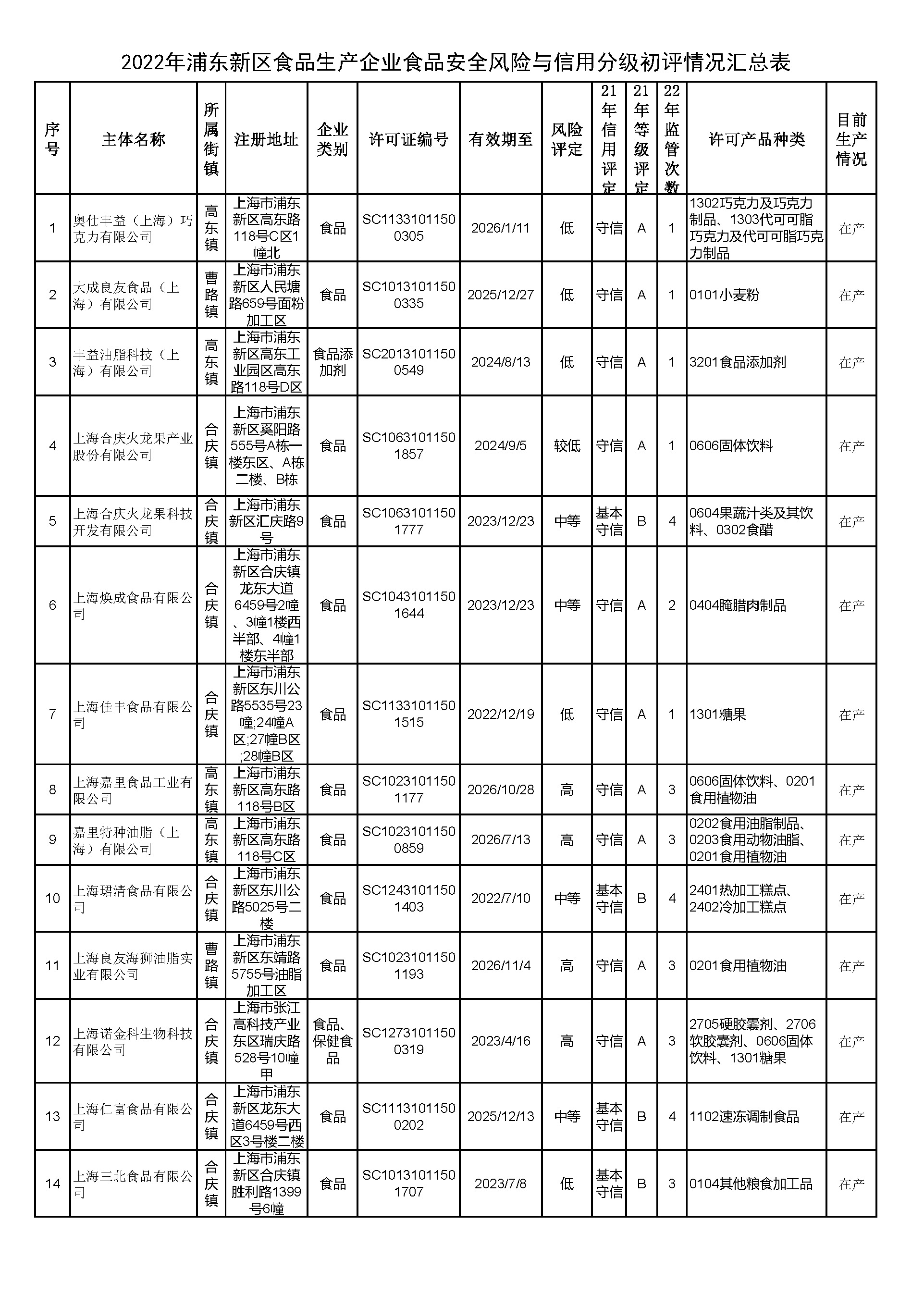 2022年浦东新区食品生产企业食品安全风险与信用分级初评情况